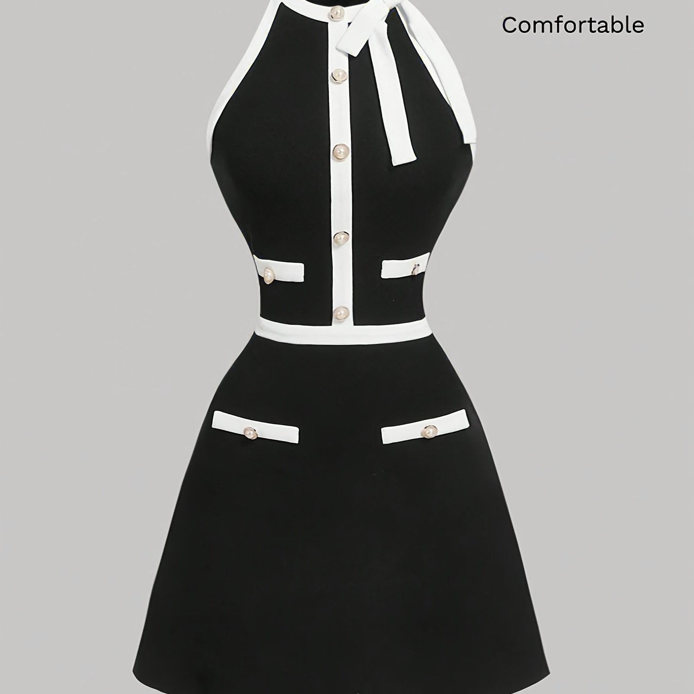 TEMU 여성용 우아한 라운드넥 민소매 리본 장식 버튼 원피스 여성용 블랙 앤 화이트 컬러 블록 A라인 숏丈 드레스 신부 들러리 드레스 여성용