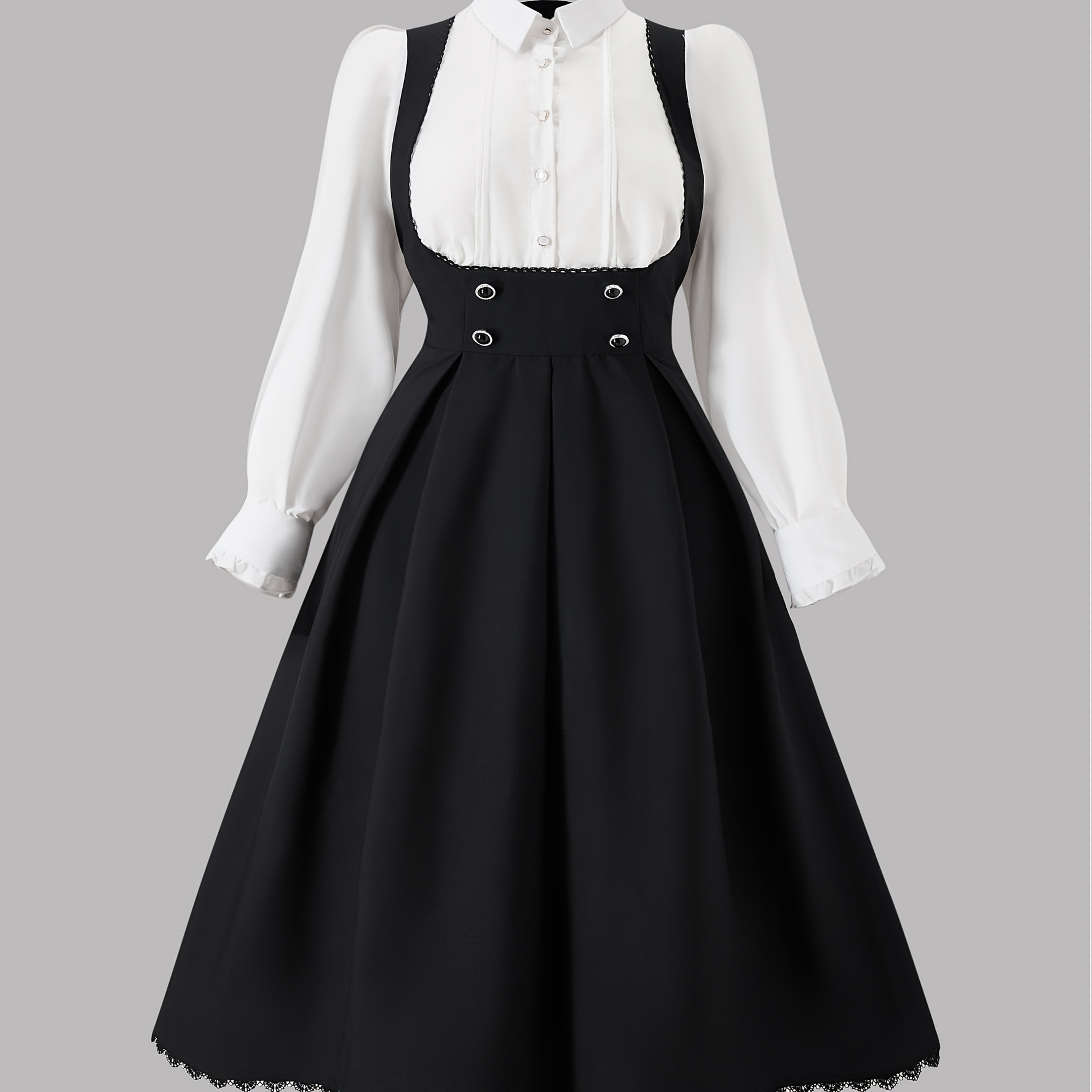 TEMU 가을, 겨울용 블랙 앤 화이트 라운드넥 반팔 핏 롱 드레스