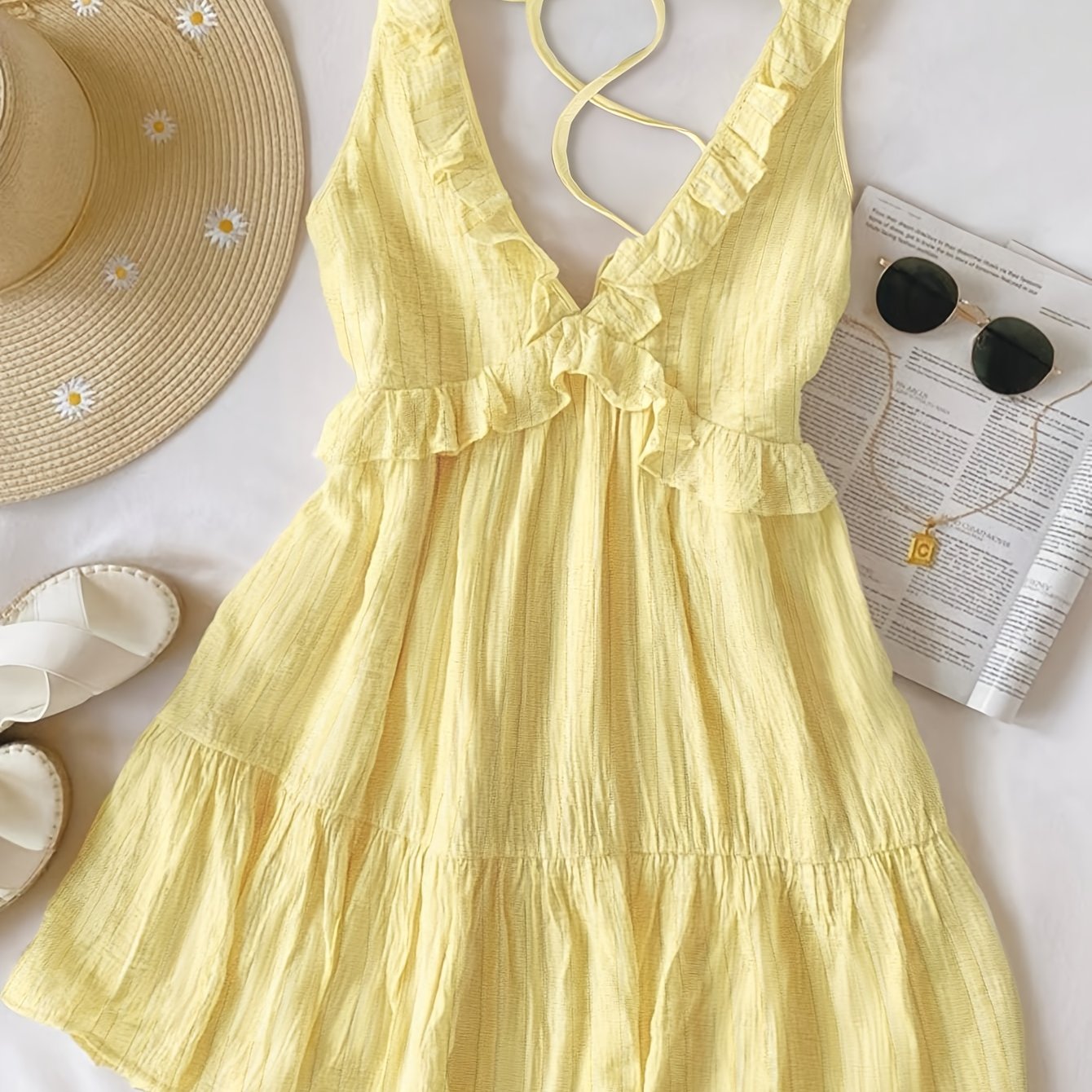 TEMU 솔리드 컬러 바캉스 스타일 백리스 레이스 숏 스커트 여성용 기발한 V넥 섹시 멜빵 드레스
