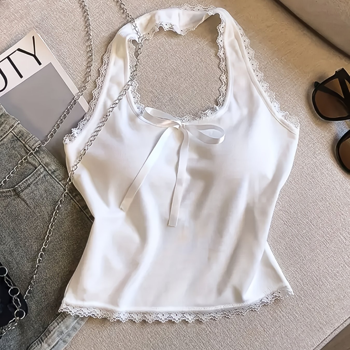 TEMU 여성용 레이스 보우 홀터넥 탑 - 내장형 패드 컵, 노백 슬리브리스 블라우스 셔츠, 슬림핏 숏 레이어링 아우터웨어, 기계 세탁 가능한 솔리드 컬러, 비치웨어, 파티 & 일상복용