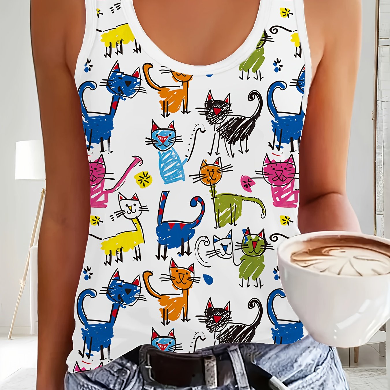 TEMU 여성용 민소매 고양이 프린트 블라우스 - 귀여운 새끼고양이 & 태비 고양이 디자인 라운드넥 탑, 봄/가을 캐주얼 웨어, 매일 입기 좋은 민소매 셔츠, 세탁기 사용 가능