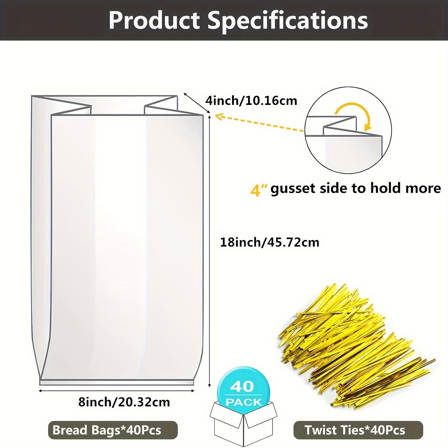 TEMU 가정에서 만든 빵 포장용 대형 비닐 봉투 40개입, 크기 8X4X18인치, 묶음 끈과 프린트 디자인 포함