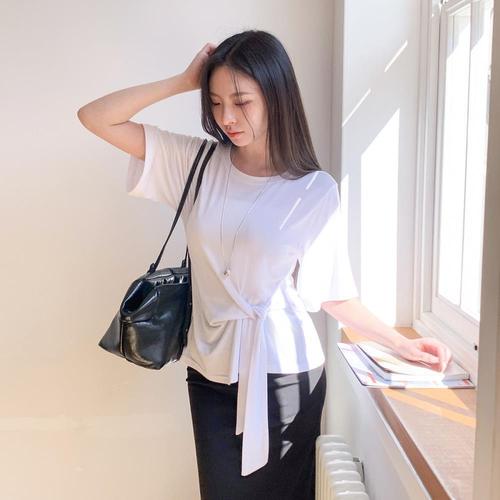[다잇템]여성 편한 U넥 리본 페미닌 포인트 티셔츠 상의