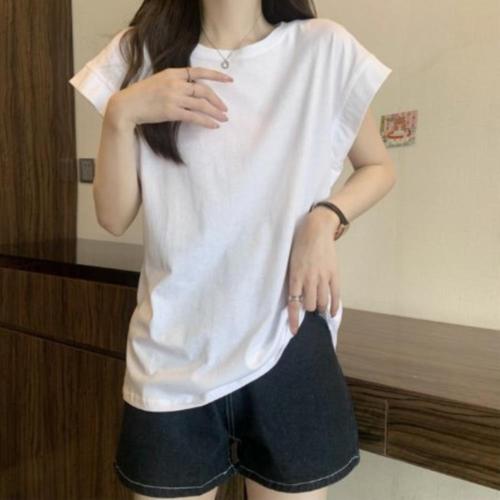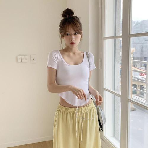 플러스 사이즈 흰색 반팔 U넥 티셔츠 여성용 트렌디한 골지 여름 슬리밍 배 커버 어깨 높이 탑