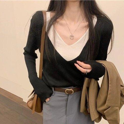[아리엘스타일]브이넥 레이어드 슬림니트 보브링레이어드니트