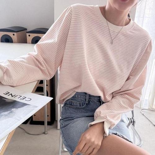 [브이와이][VY] 여자 캠퍼스룩 수학여행 분홍색 컷오프 줄무늬 티셔츠_16423726_588847