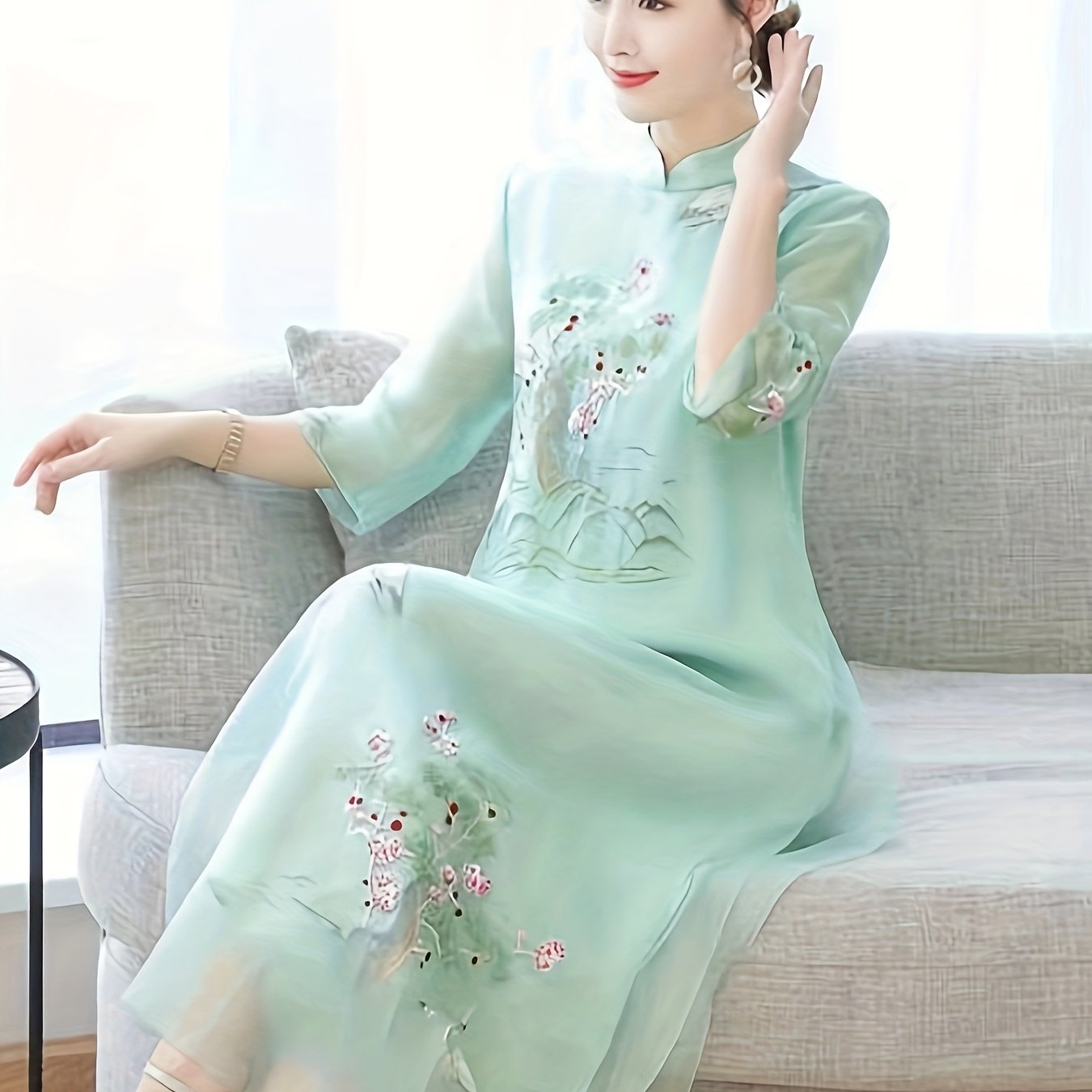 TEMU 전통 스타일의 지퍼가 달린 이중 레이어 롱 자수 치파오 드레스