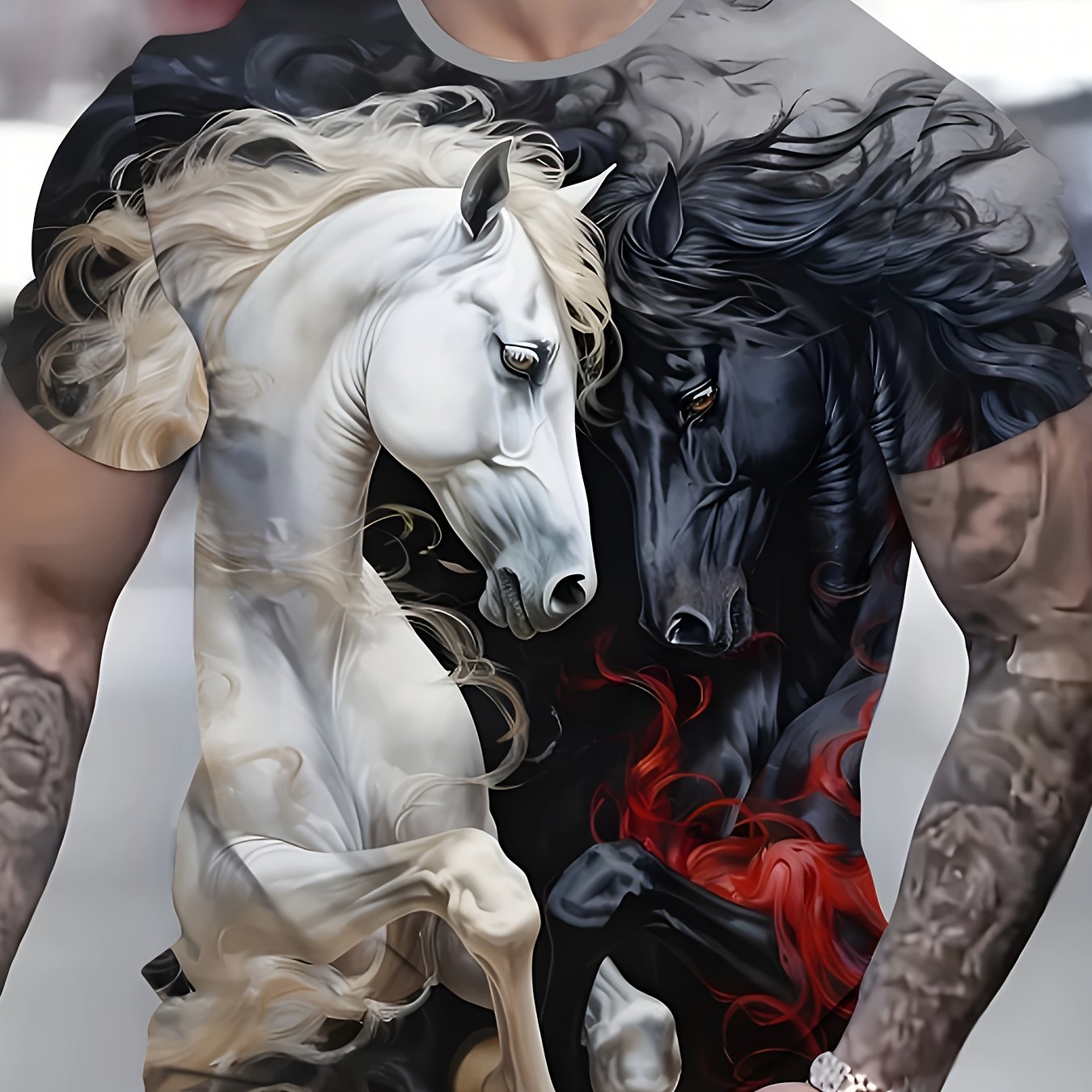 TEMU 남성용 세련된 3D 말 프린트 티셔츠 - 반팔, 크루 넥, 캐주얼 여름 상의, 집 및 야외용, 블랙 앤 화이트 디자인, 동적 블랙 말과 화이트 말, 편안한 핏 티 | 현대 캐주얼 스타일 | 부드러운 텍스처 재질
