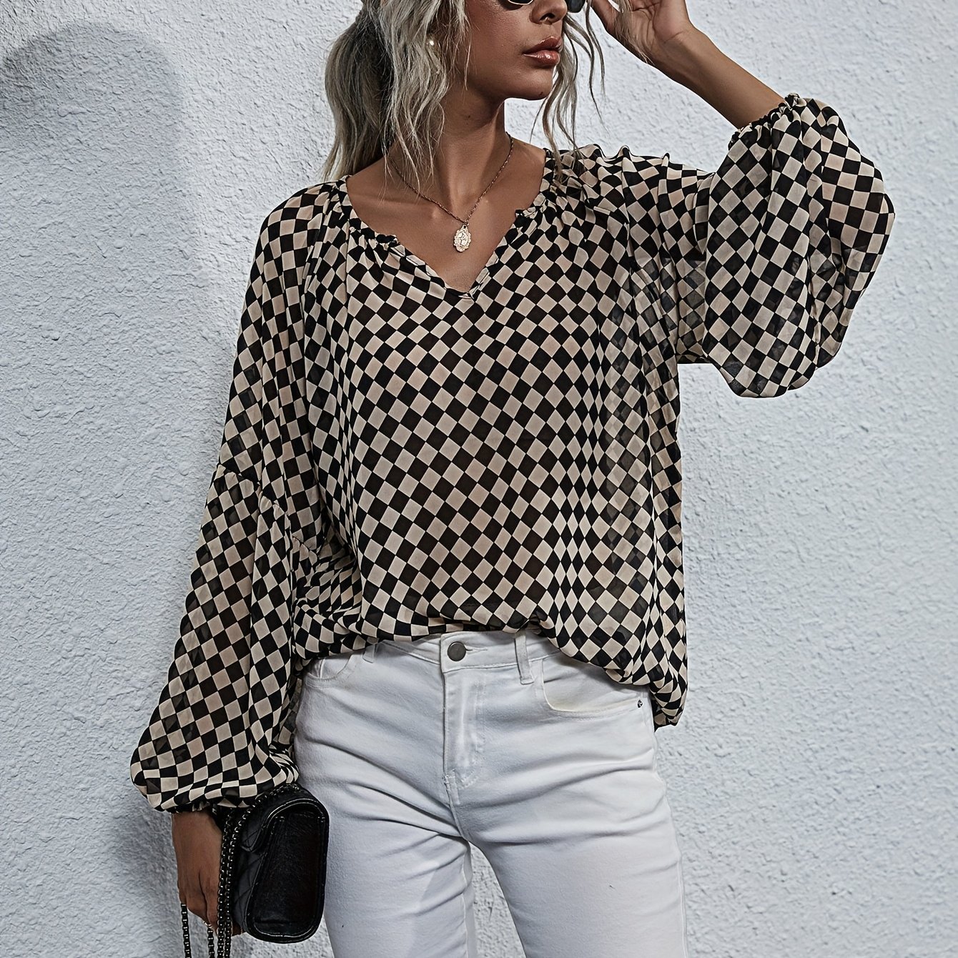TEMU 우아한 디자인, 노치 체크 비숑 슬리브 쉬폰 셔츠, 긴팔 탑