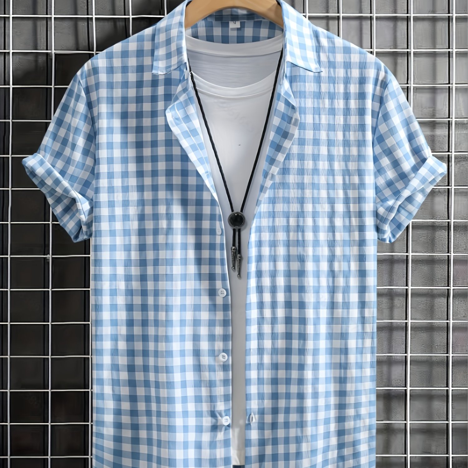 TEMU 스프링/가을 스타일 남성 패션 캐주얼 체크 무늬 반팔 버튼업 셔츠